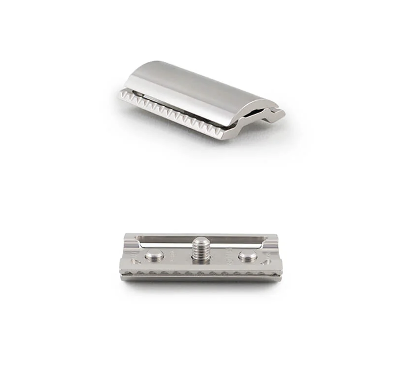 Finish: Please note, these razors are tools, not jewels. We use a vibratory tumbling finish process which maintains the highest possible tolerances for the razors. This means the razors will not be mirror finished and will not be mark-free. The razors may have some milling marks or finishing marks. The razors can always be jewelry polished by the client later but our goal is to sell the razor at the best possible tolerances and lowest possible price. The metal-on-metal contact from the handle locking against the base-plate will create a ring mark on the base. It’s common for handles to have micro dents from the tumbled finish.