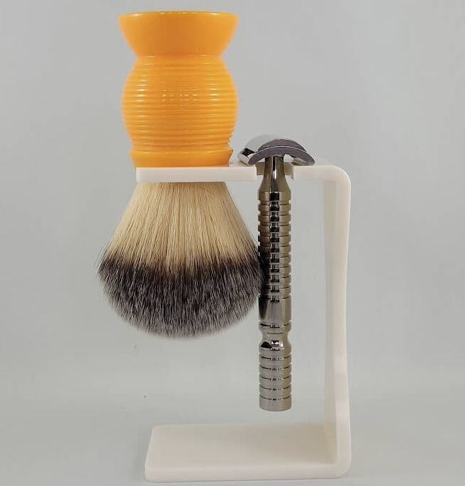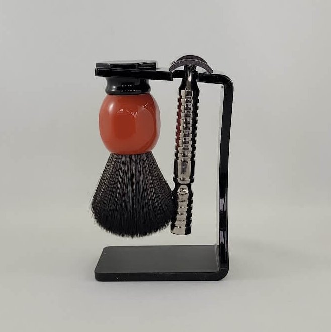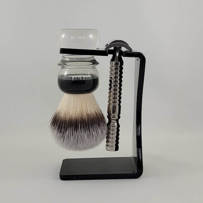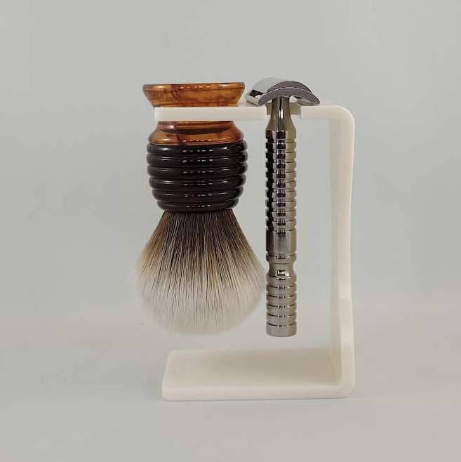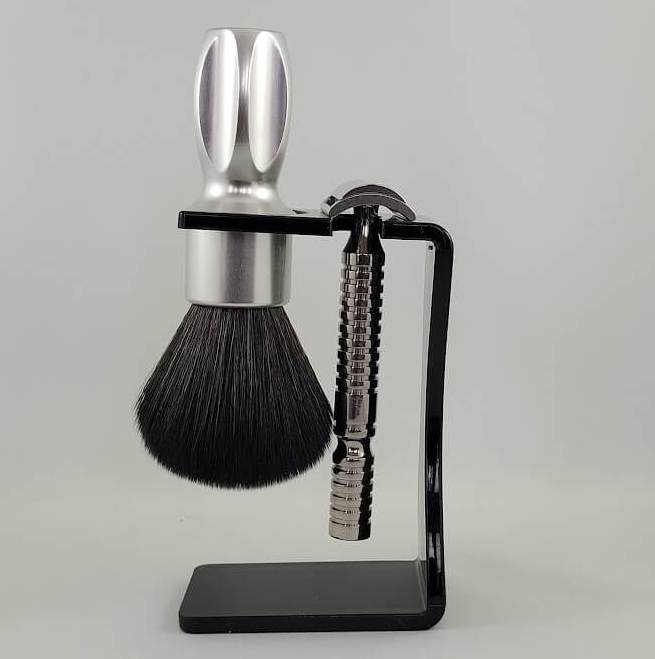 “Do you have a brush stand that holds your brushes from the handle, not from where the hairs/fibers meets the handle?” We have now improved our acrylic brush stand to include a space for a razor as well. You don’t need to hang your razor but we figured it would be a great addition for those who wanted to use the space for both a brush and a razor.