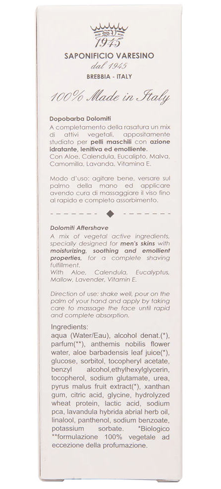 A refined formulation which gives the product the characteristics between an alcohol EDT (alcohol from vegetable origin) and a fluid cream. As for the shaving soap, the Dolomiti scent blends in with the alcohol-base and the several vegetable additives, creating a tail note tail amber and woody vetiver, patchouli and cedar. The use of food preservatives ensures a formulation without quality compromise, for the utmost protection of your skin.